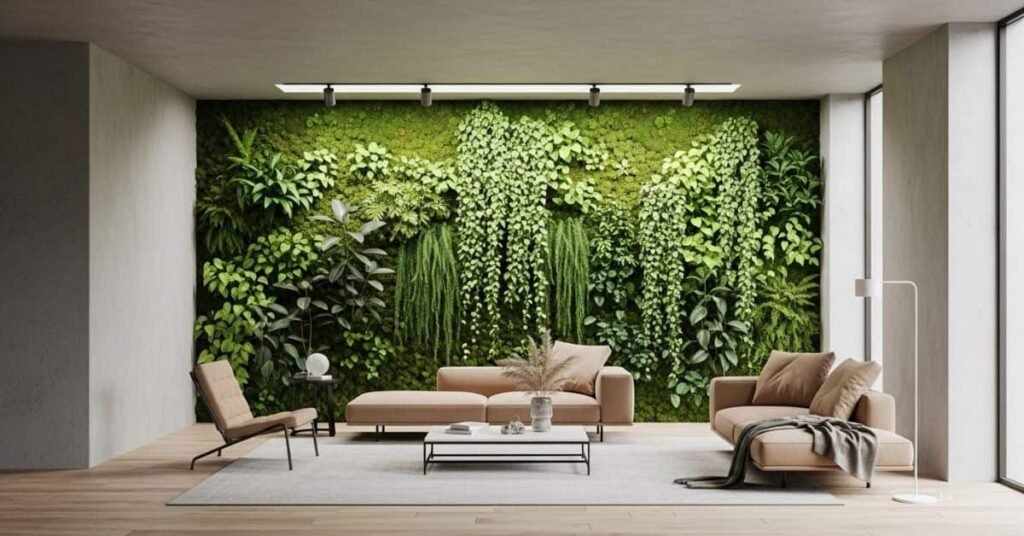 A vertical garden not only saves space but also acts as a living piece of art. You can design it with ferns, succulents, or small trailing plants that thrive indoors. If you prefer a more subtle touch, arrange staggered floating shelves and style them with small potted plants, framed prints, and natural decor pieces. The result is a visually balanced wall that feels organic yet curated.