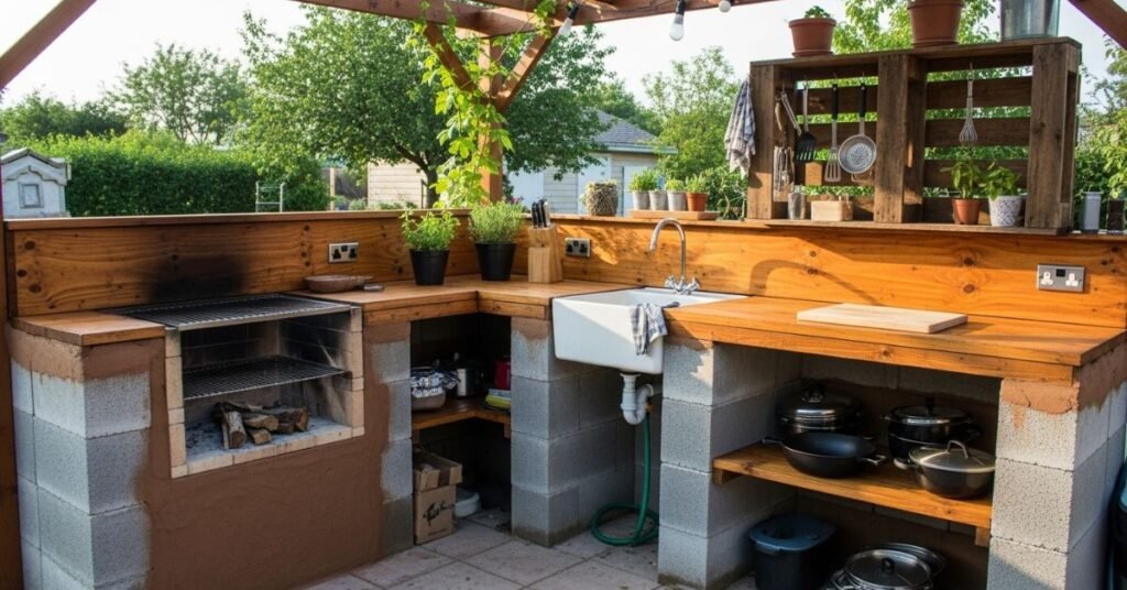 • For a Rustic or Farmhouse Style: Embrace natural materials. A frame made of pressure-treated wood and clad in reclaimed pallet wood or corrugated metal fits this style perfectly. A cedar pergola with a canvas cover and a sealed butcher block countertop completes the warm, inviting feel.